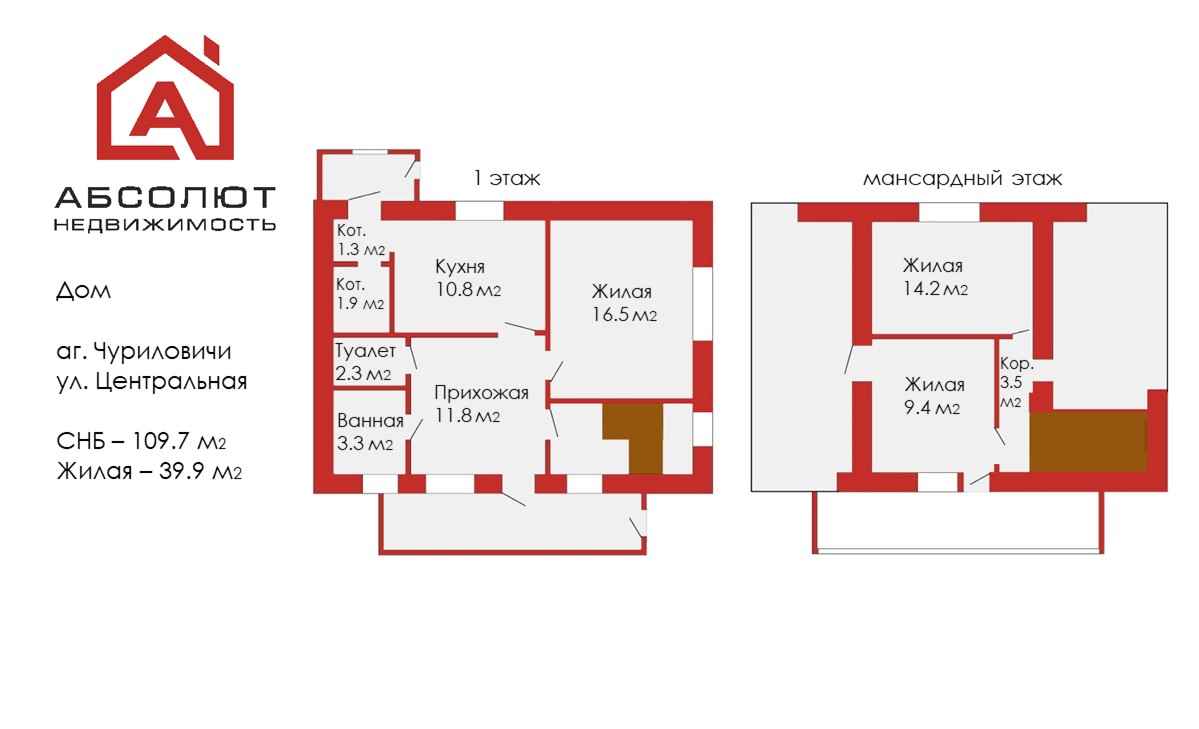 Общая площадь – 109.7 кв.м, жилая площадь – 39.9 кв.м., кухня – 10.8 кв.м.