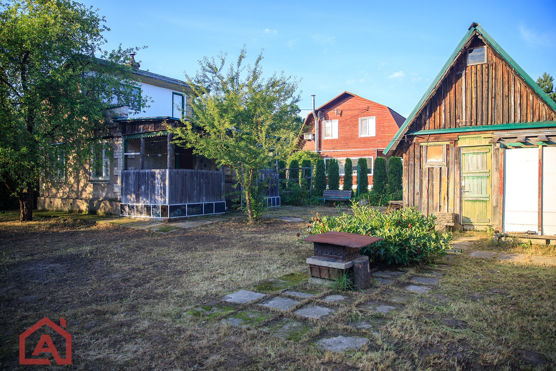 - Участок: есть сарай с погребом для инструментов и летний душ. Посажены яблони, малина, ежевика.