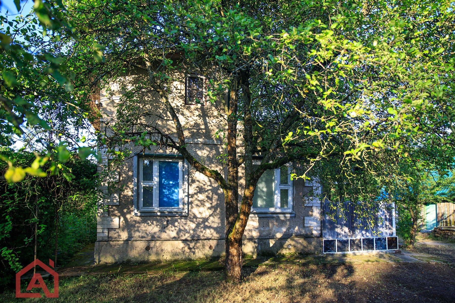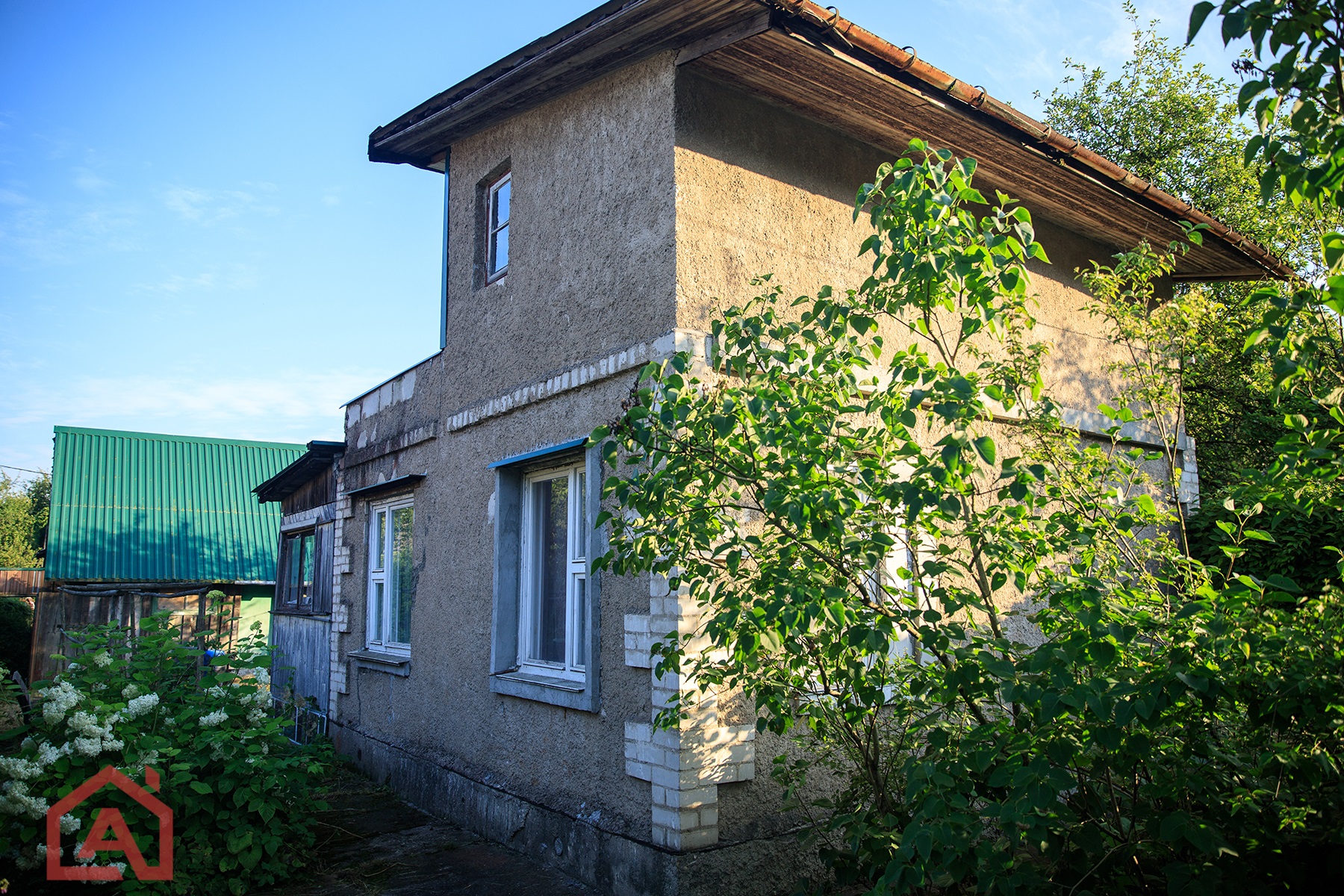 - Дом: построен в 1987 году из газосиликатных блоков. Вентилируемый ленточный фундамент, деревянные стеклопакеты, крыша – шифер.