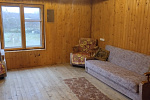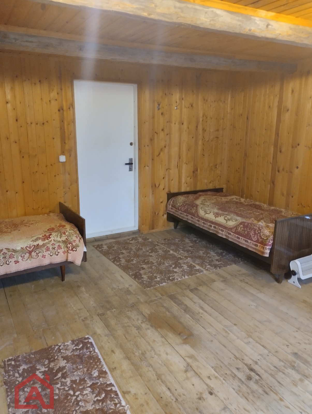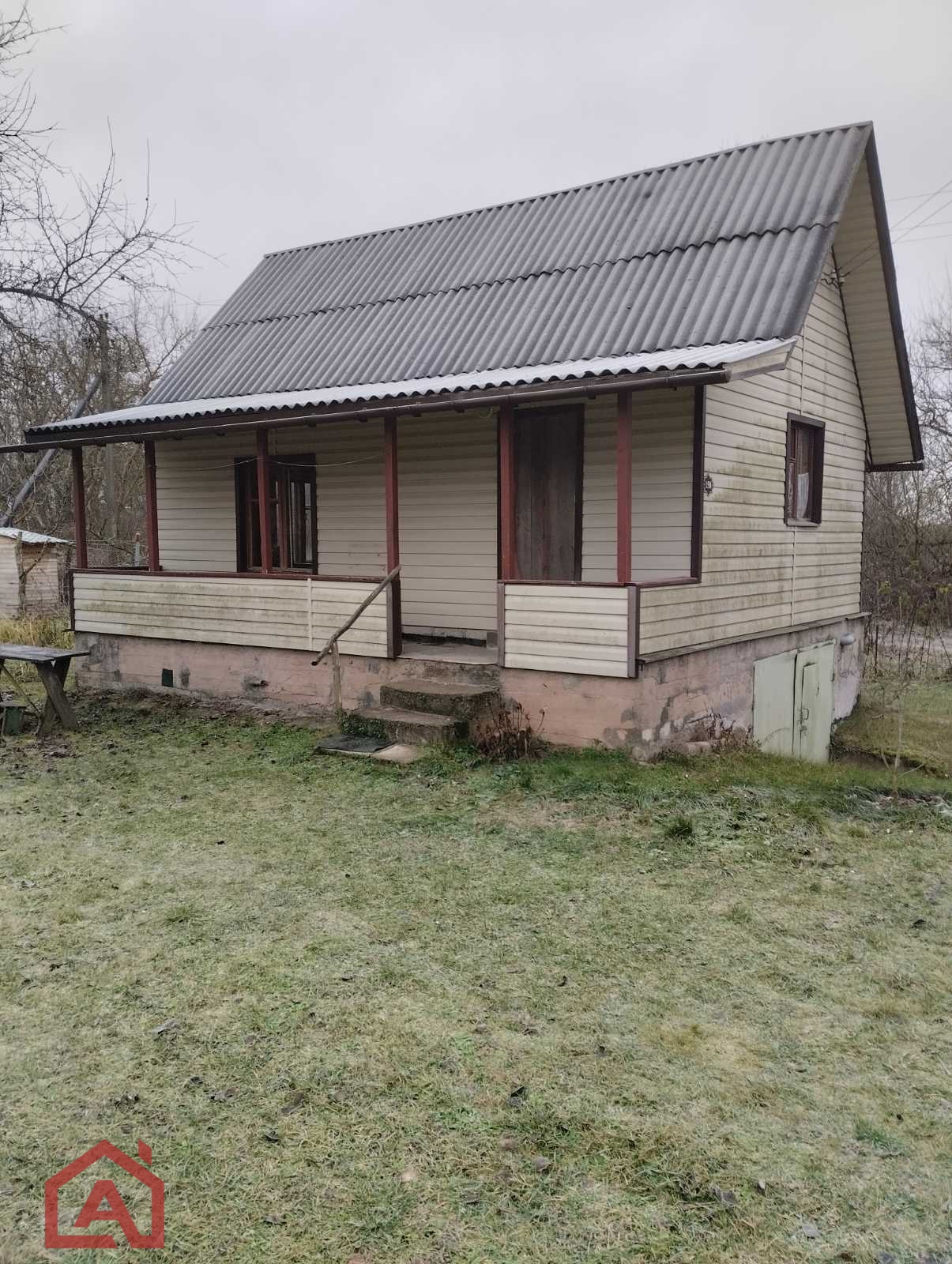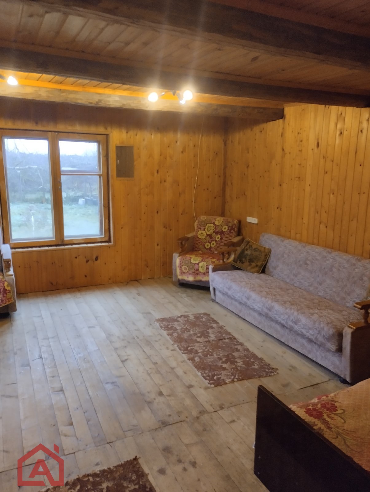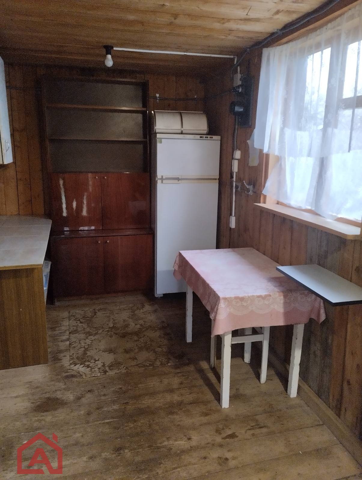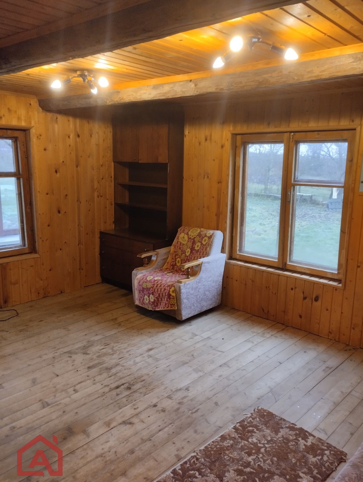 Стены сруб, окна деревянные, внутри обшит вагонкой. Крыша шифер.