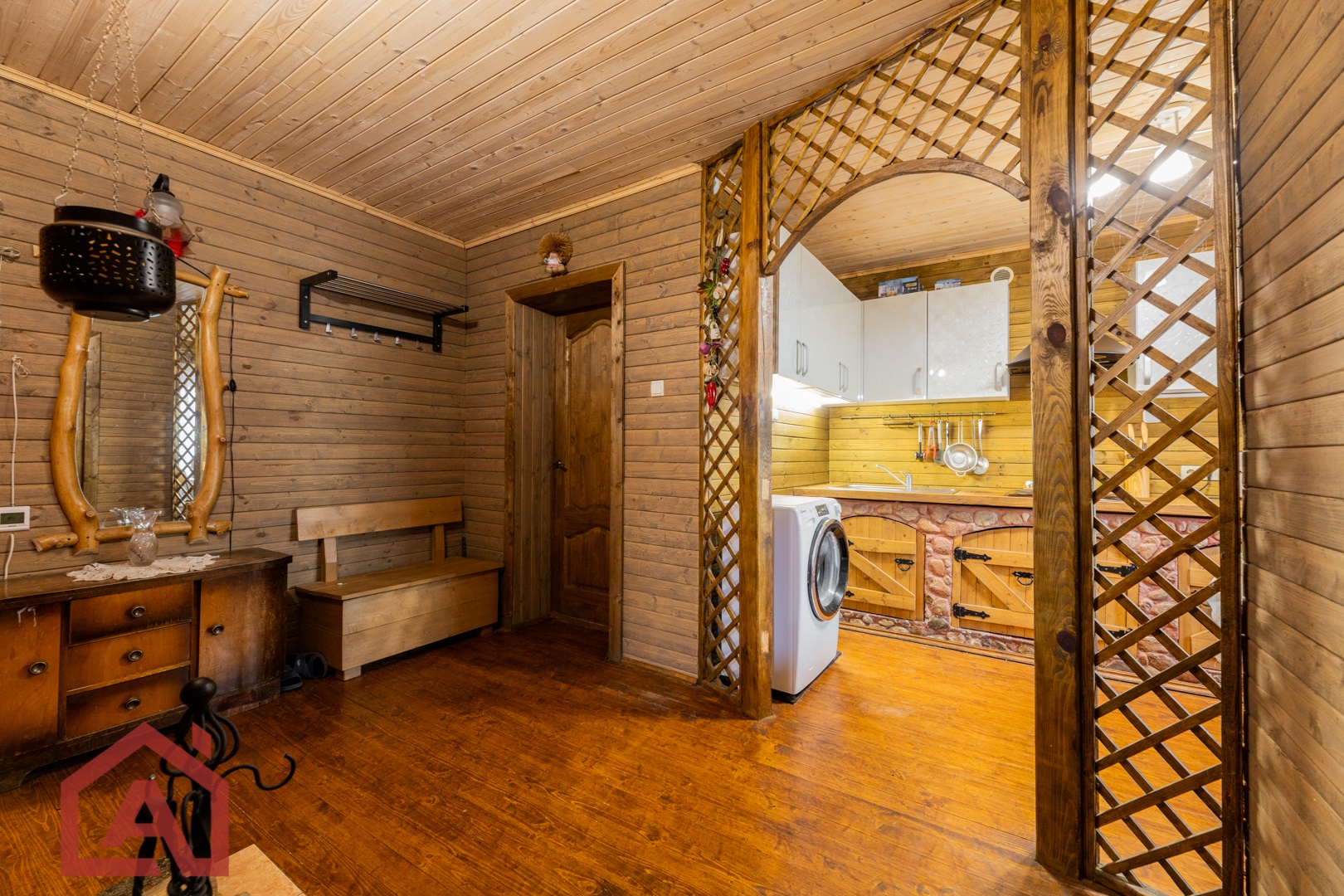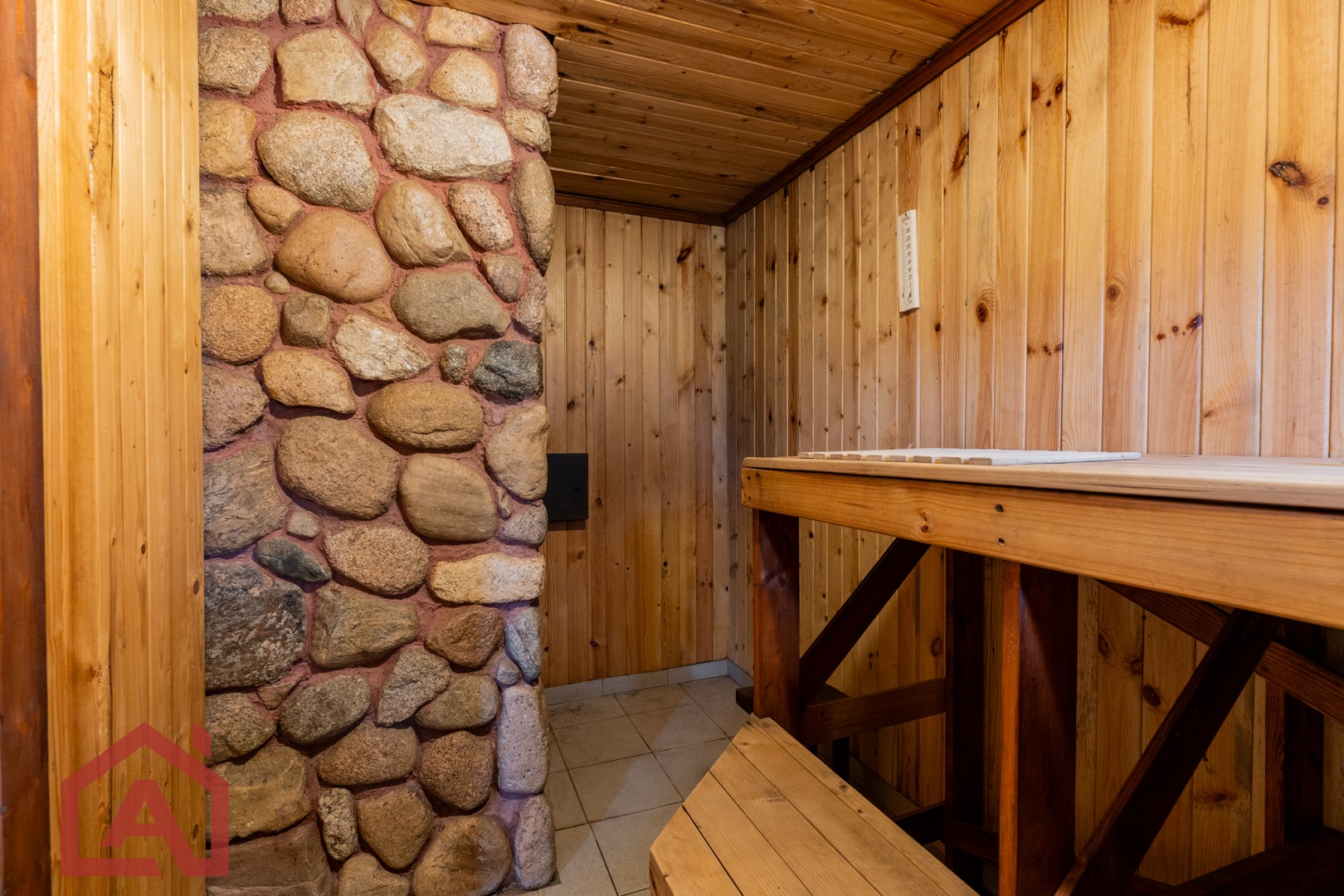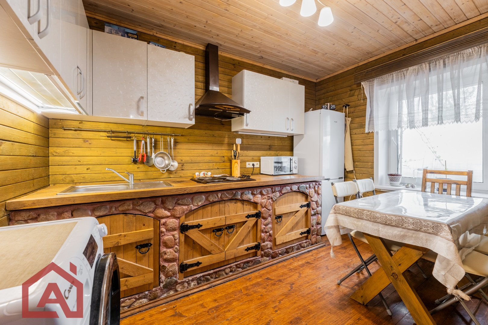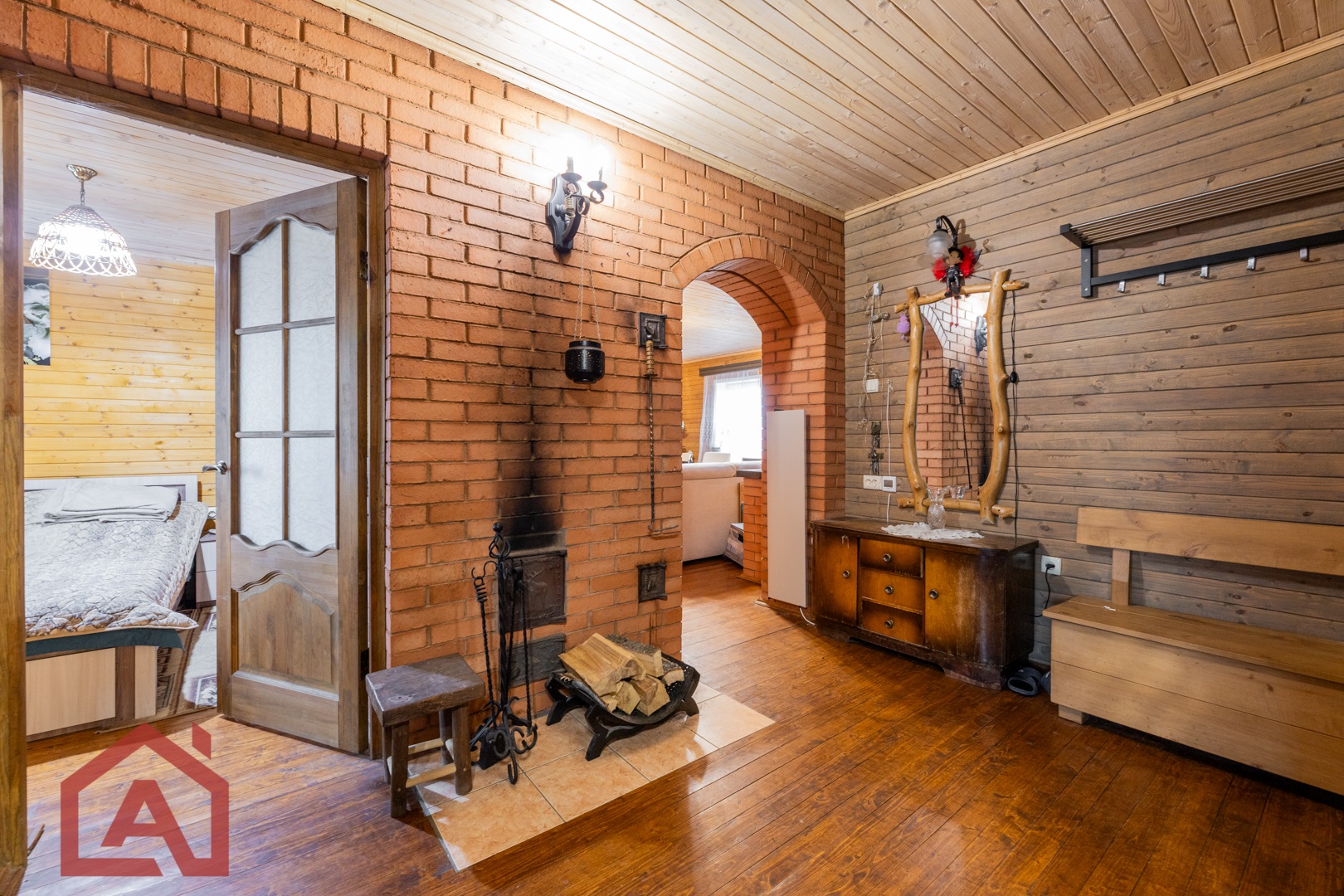 В доме установлена скважина для воды, отопление осуществляется печное и электрическое, имеется интернет, а также установлены датчики для обеспечения безопасности. Планировка дома включает две спальни, просторную гостиную с камином, кухню и санузел. Из застекленной веранды открывается восхитительный вид. На цокольном этаже находятся кладовка, погреб, техническое помещение для установки котла, а также комната для отдыха с бильярдом.