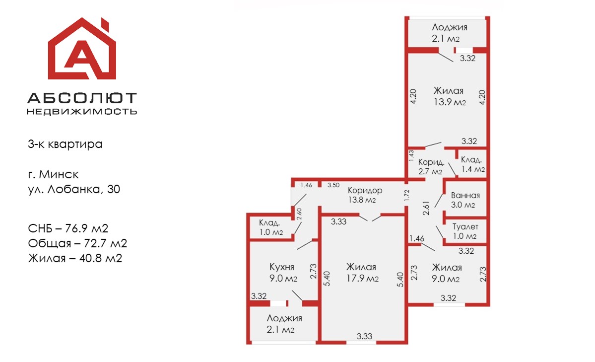 Площадь общая по СНБ 76.9 / жилая 40.8 / кухня 9.0 кв.м. Высота потолков - 2.43 м, 2-й этаж.