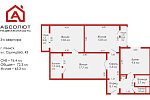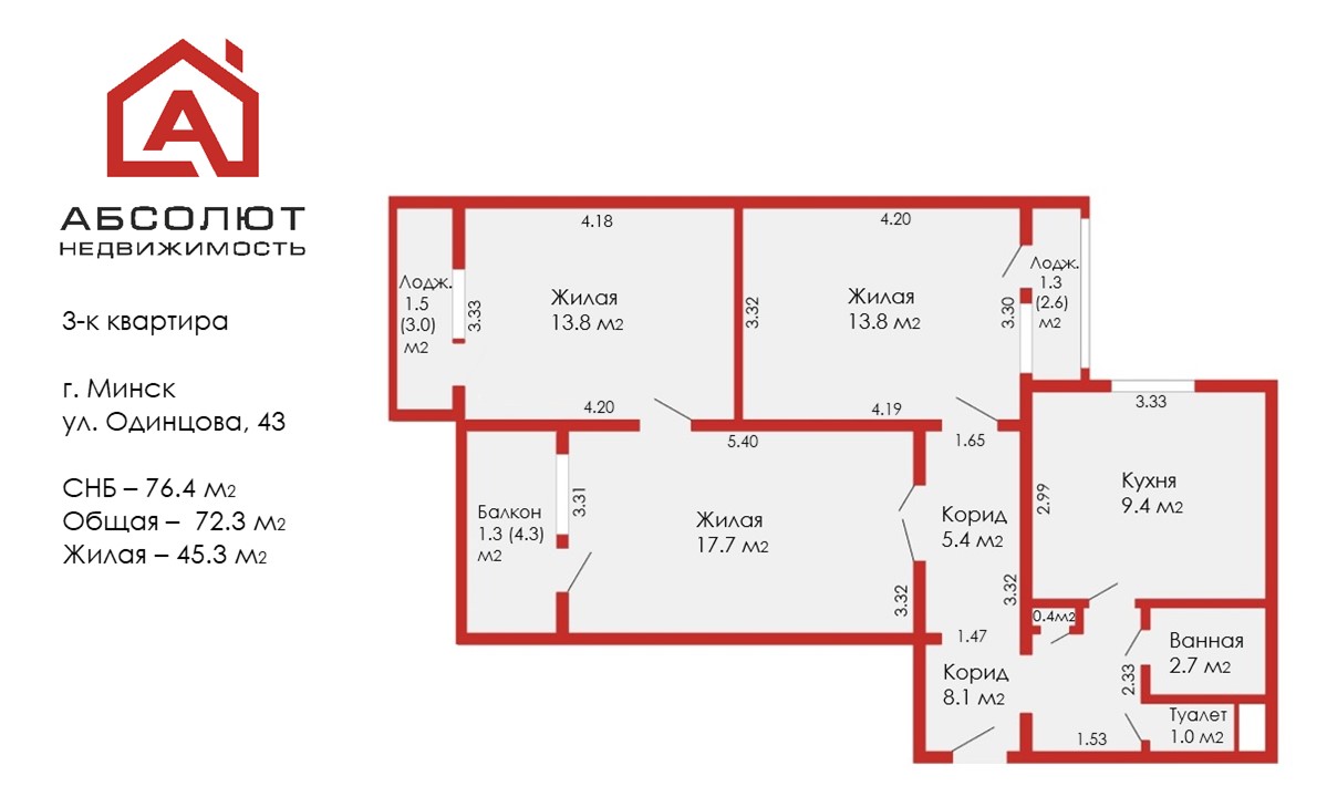 Площадь общая по СНБ 76.4 / жилая 45.3 / кухня 9.4 кв.м. Высота потолков - 2.51 м, 5-й этаж.