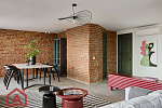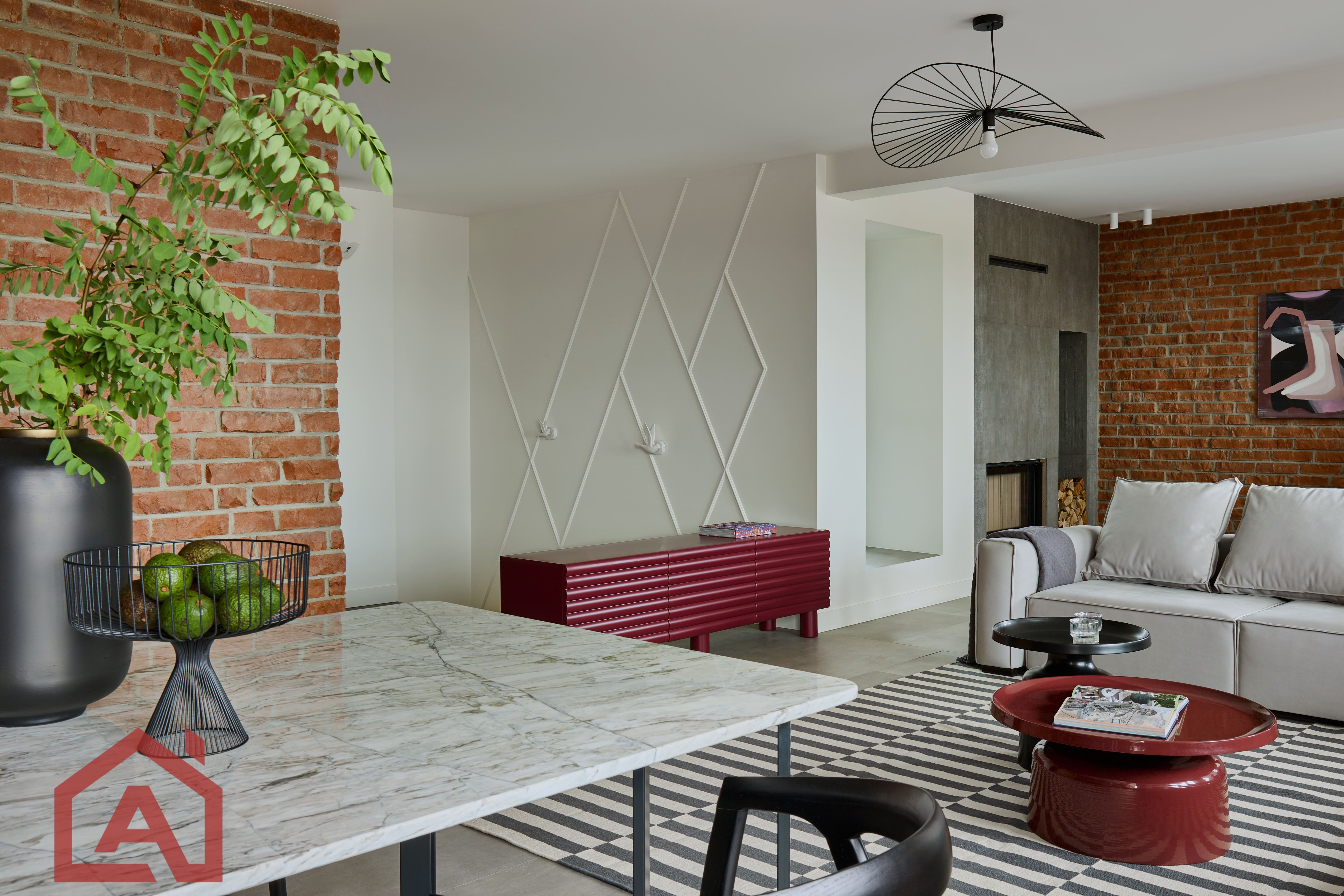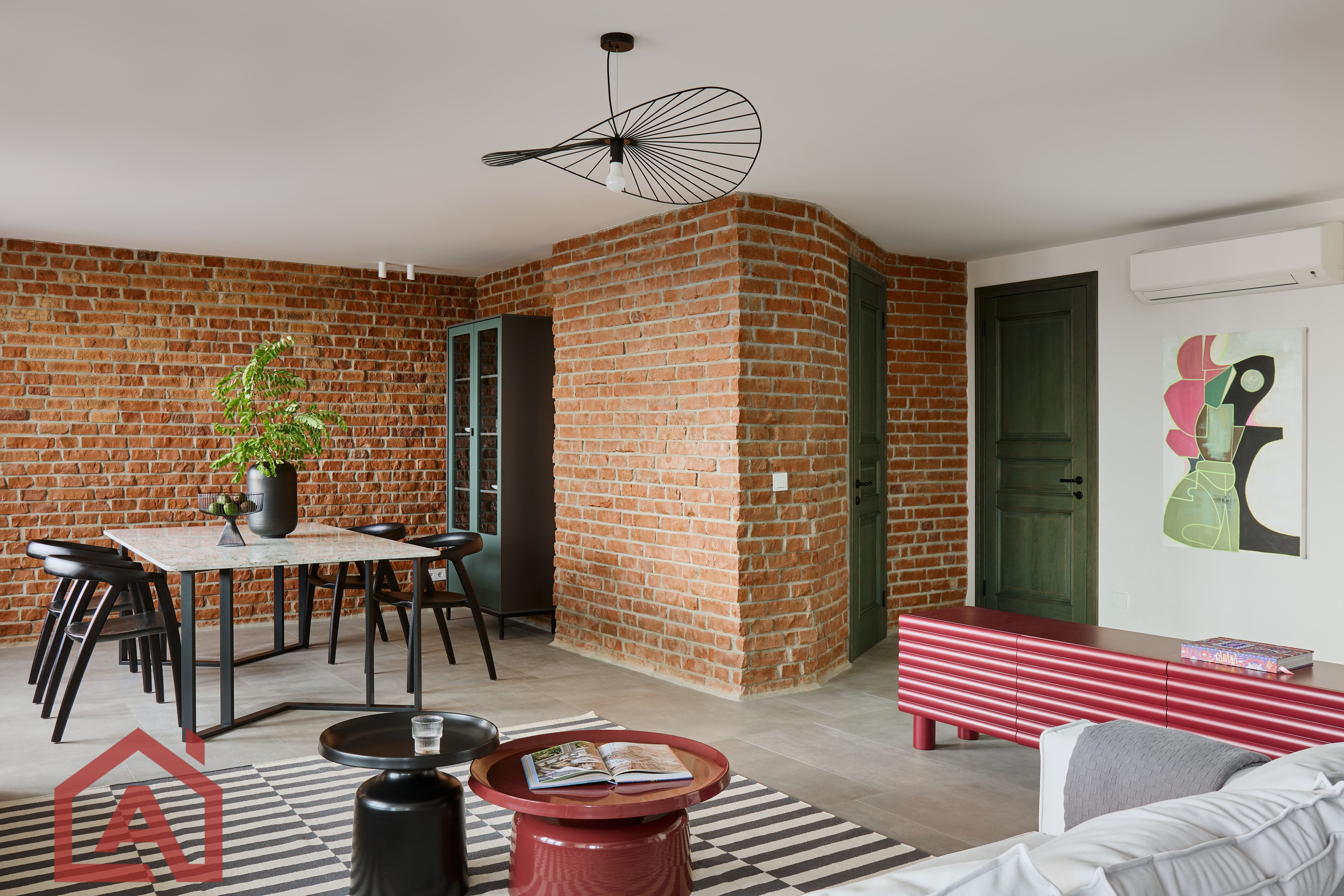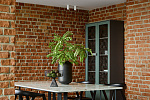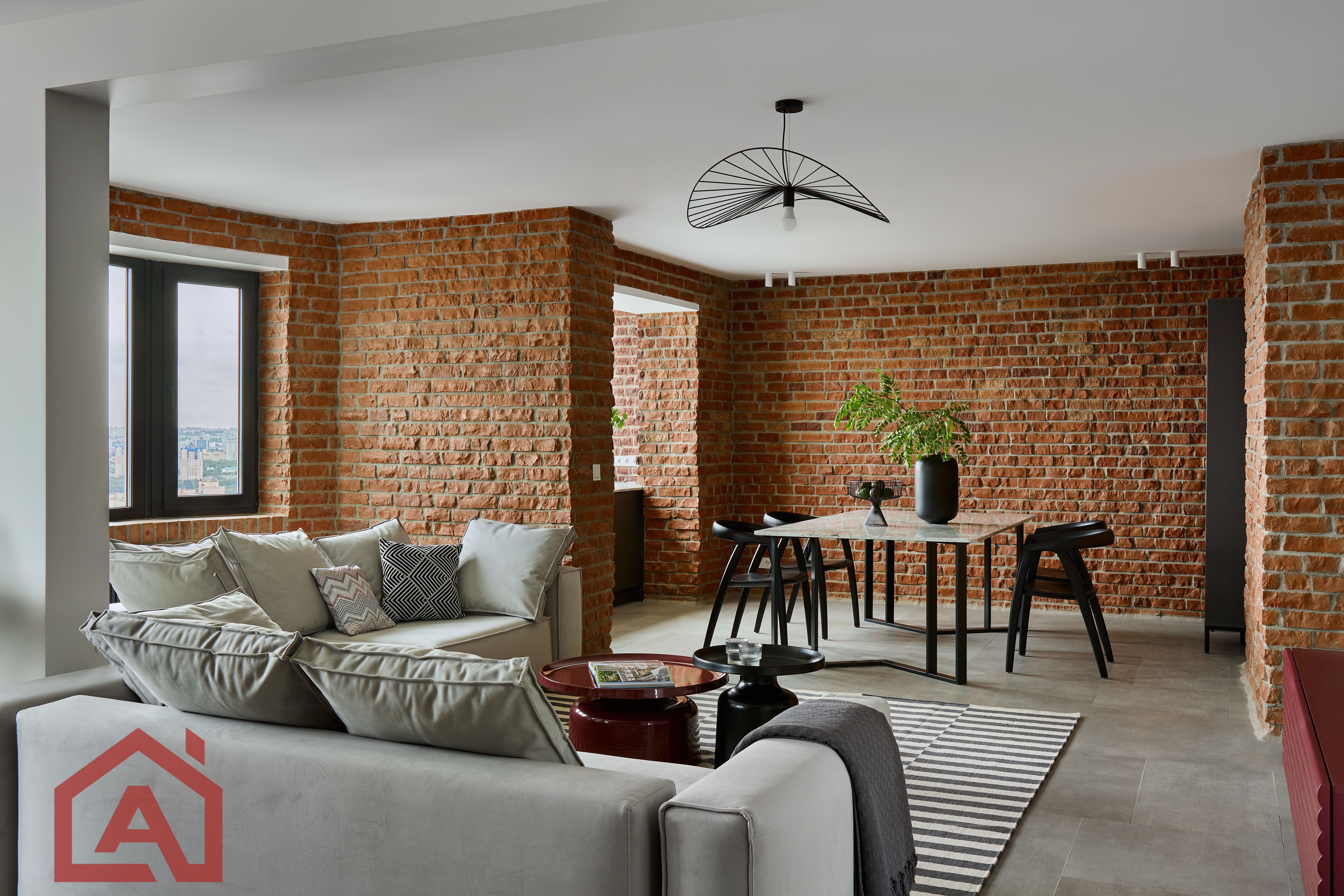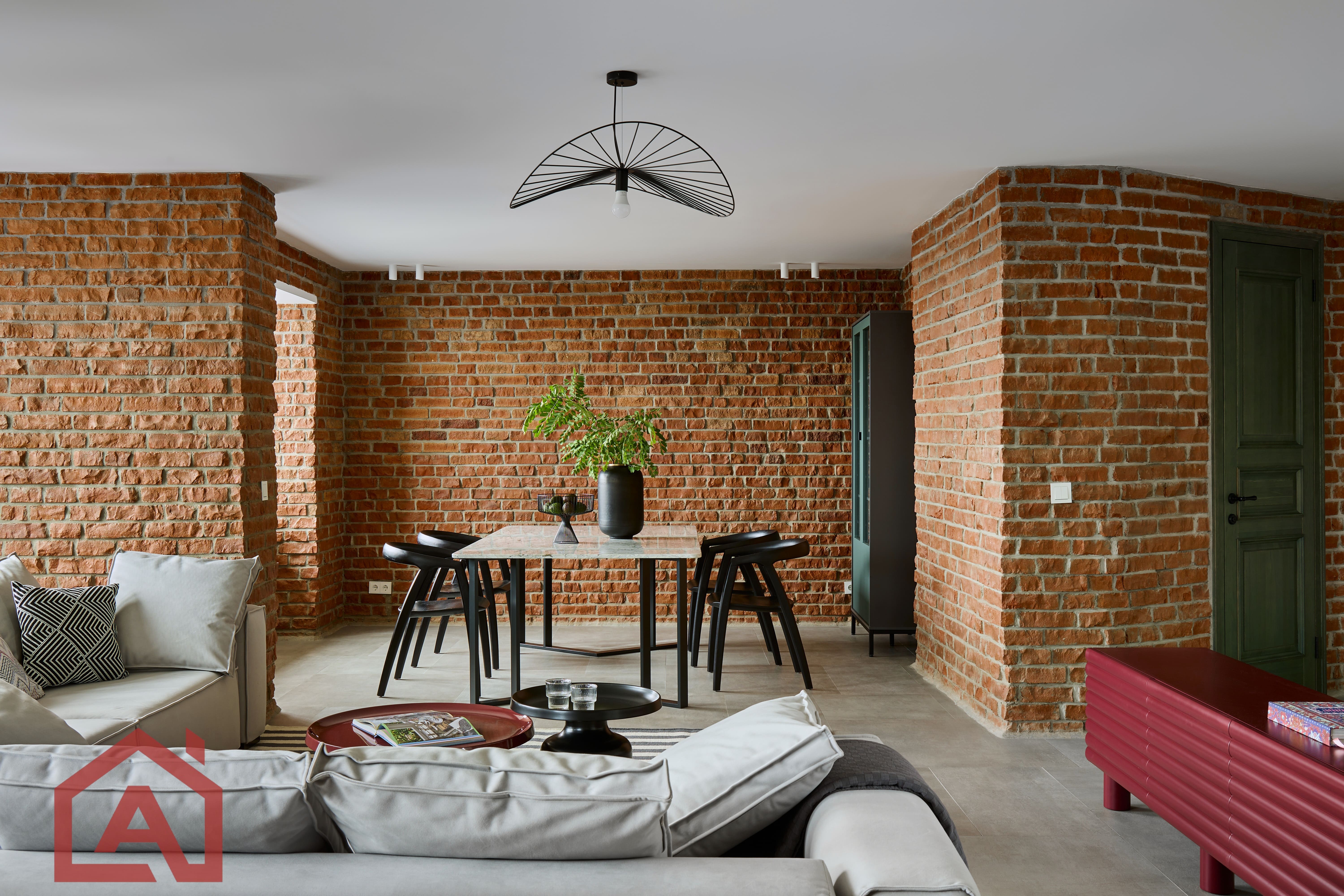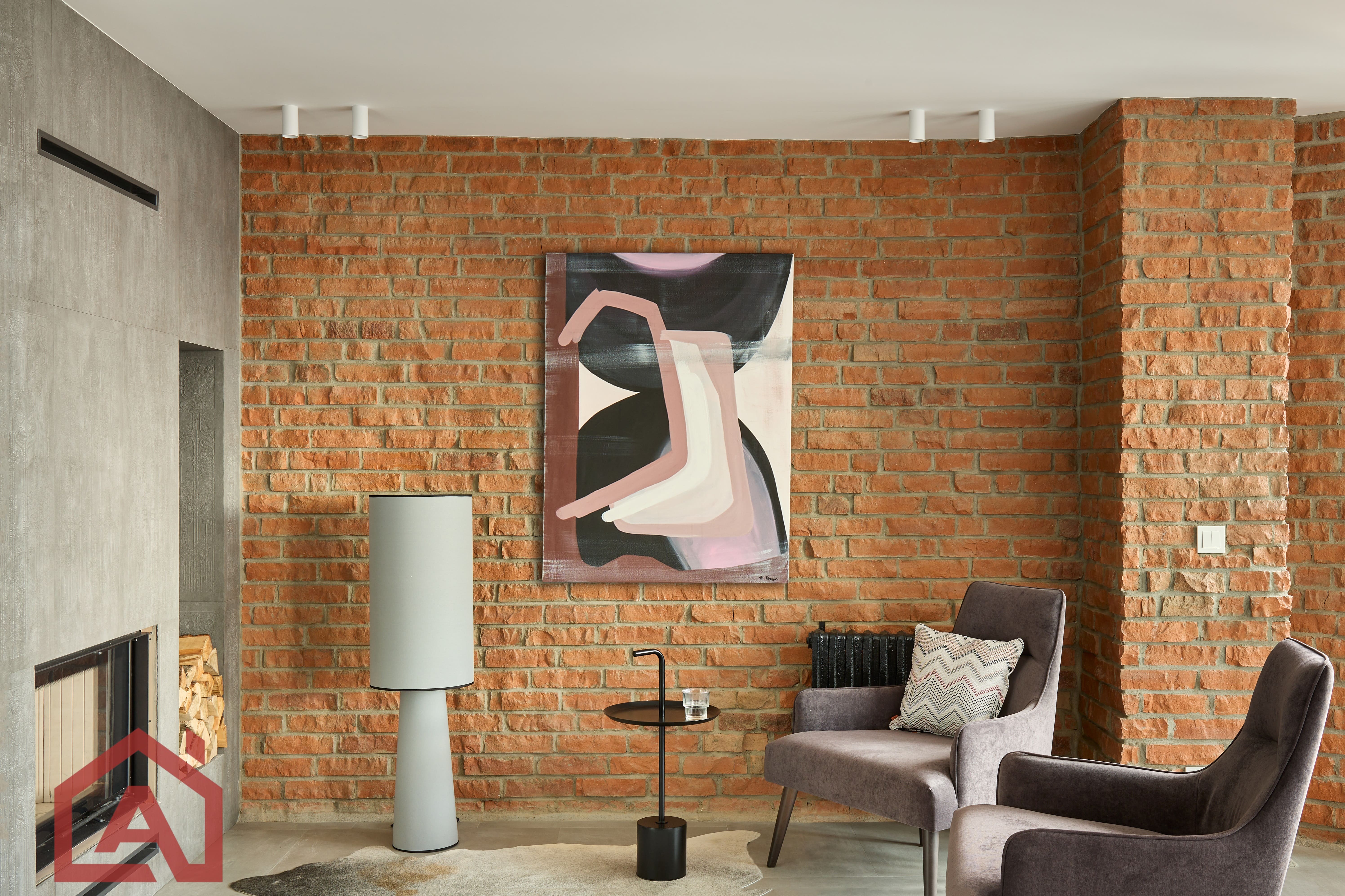 • Второй этаж оформлен в стиле лофт. Стены выложены натуральным красным кирпичом.