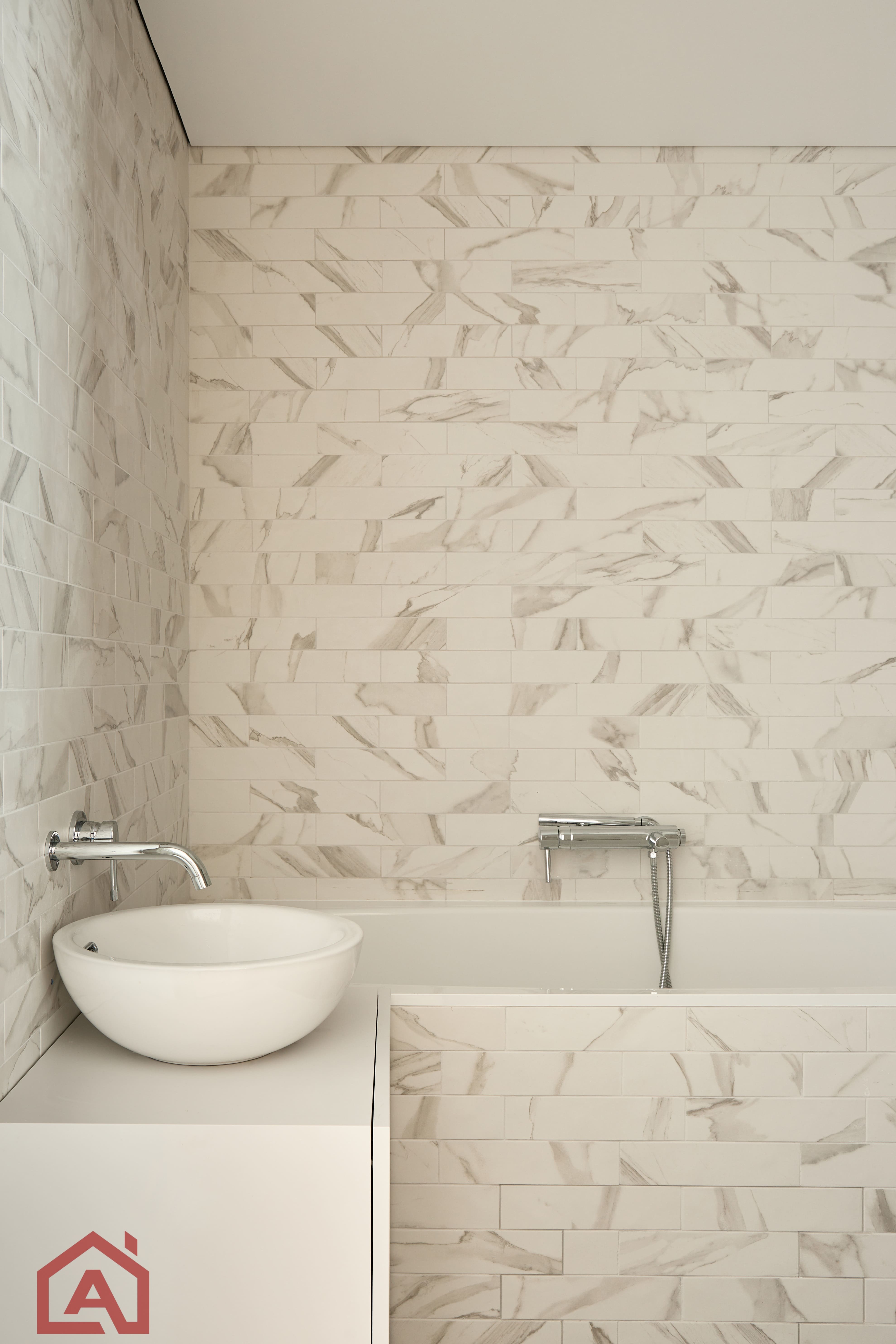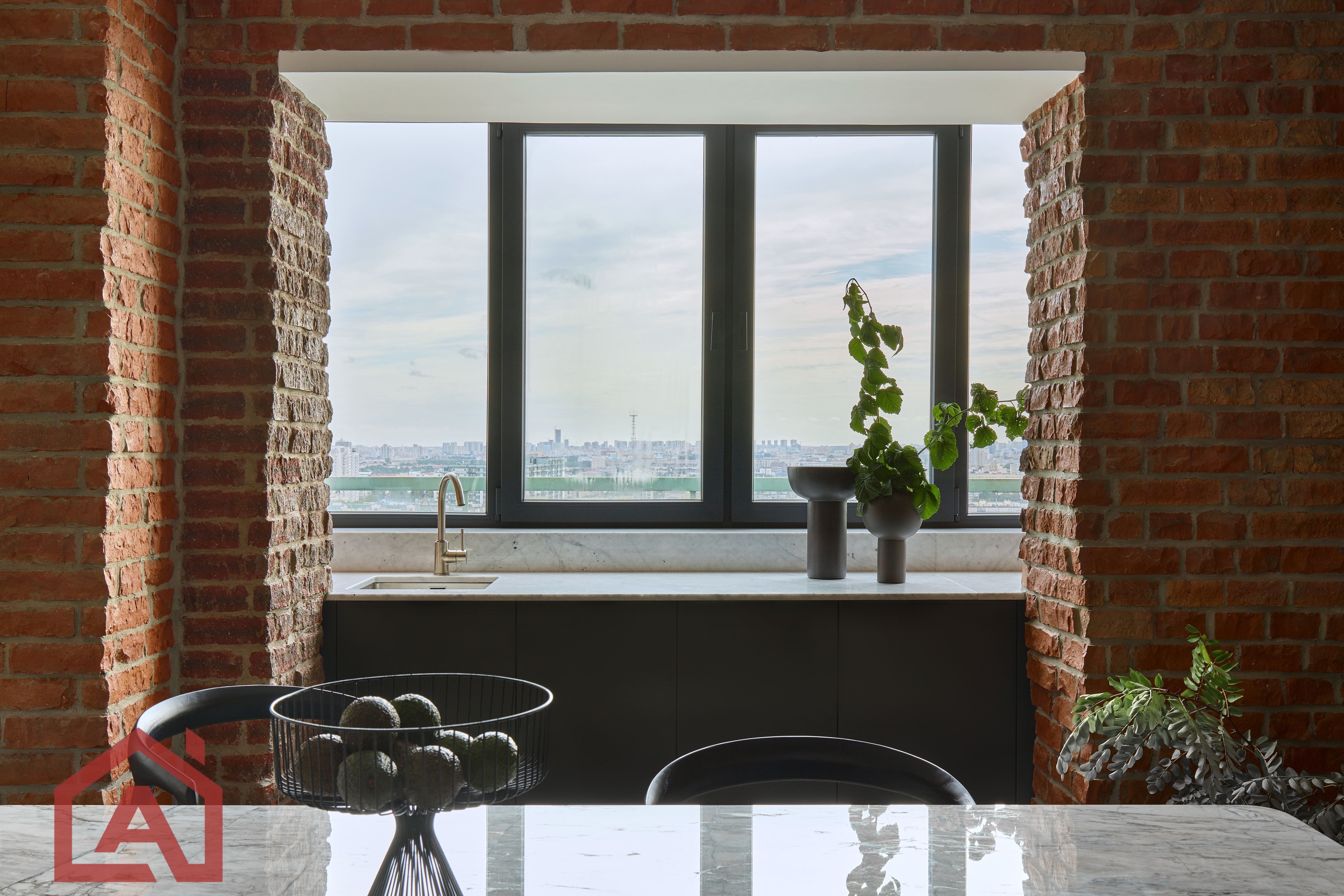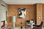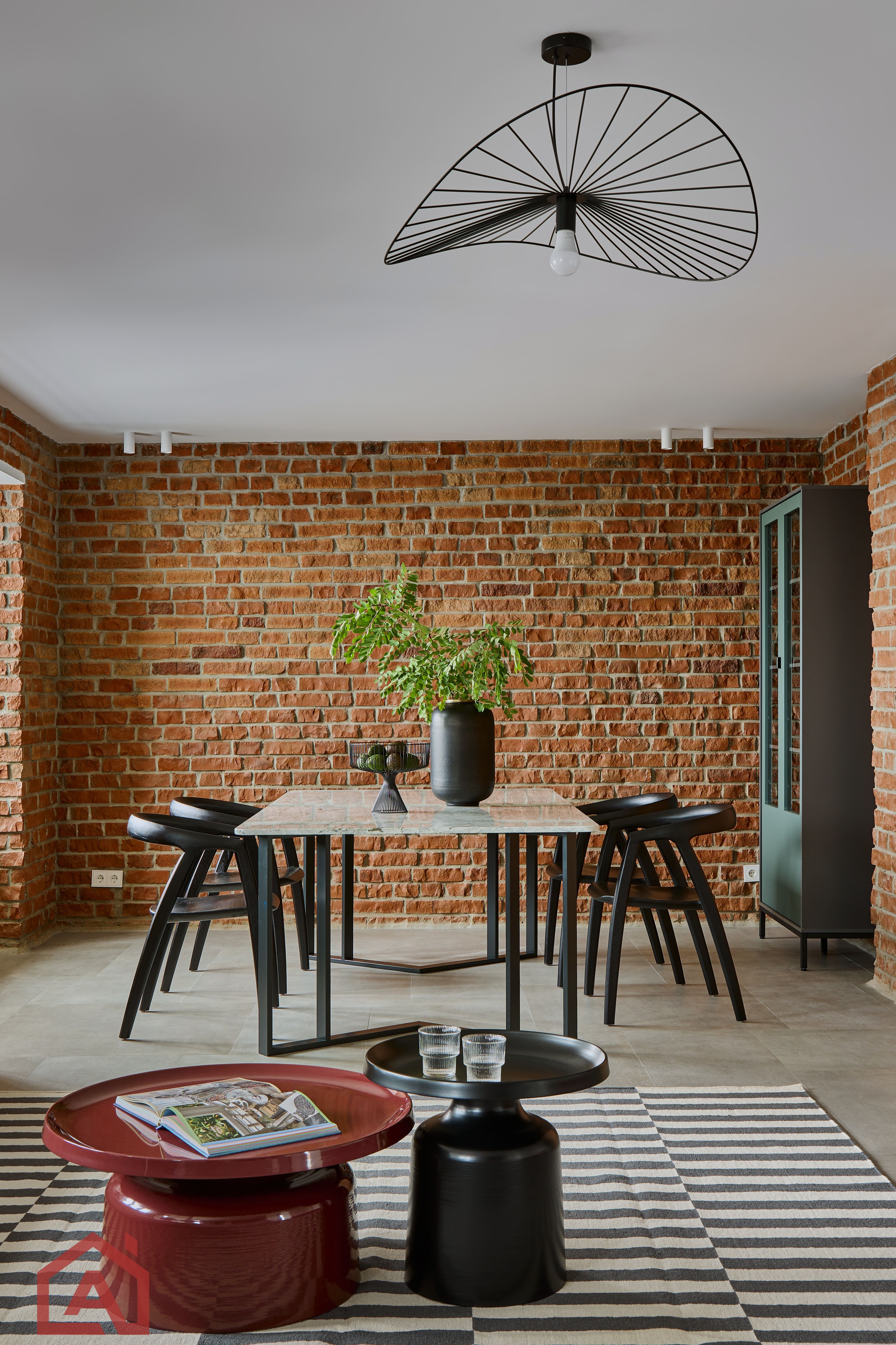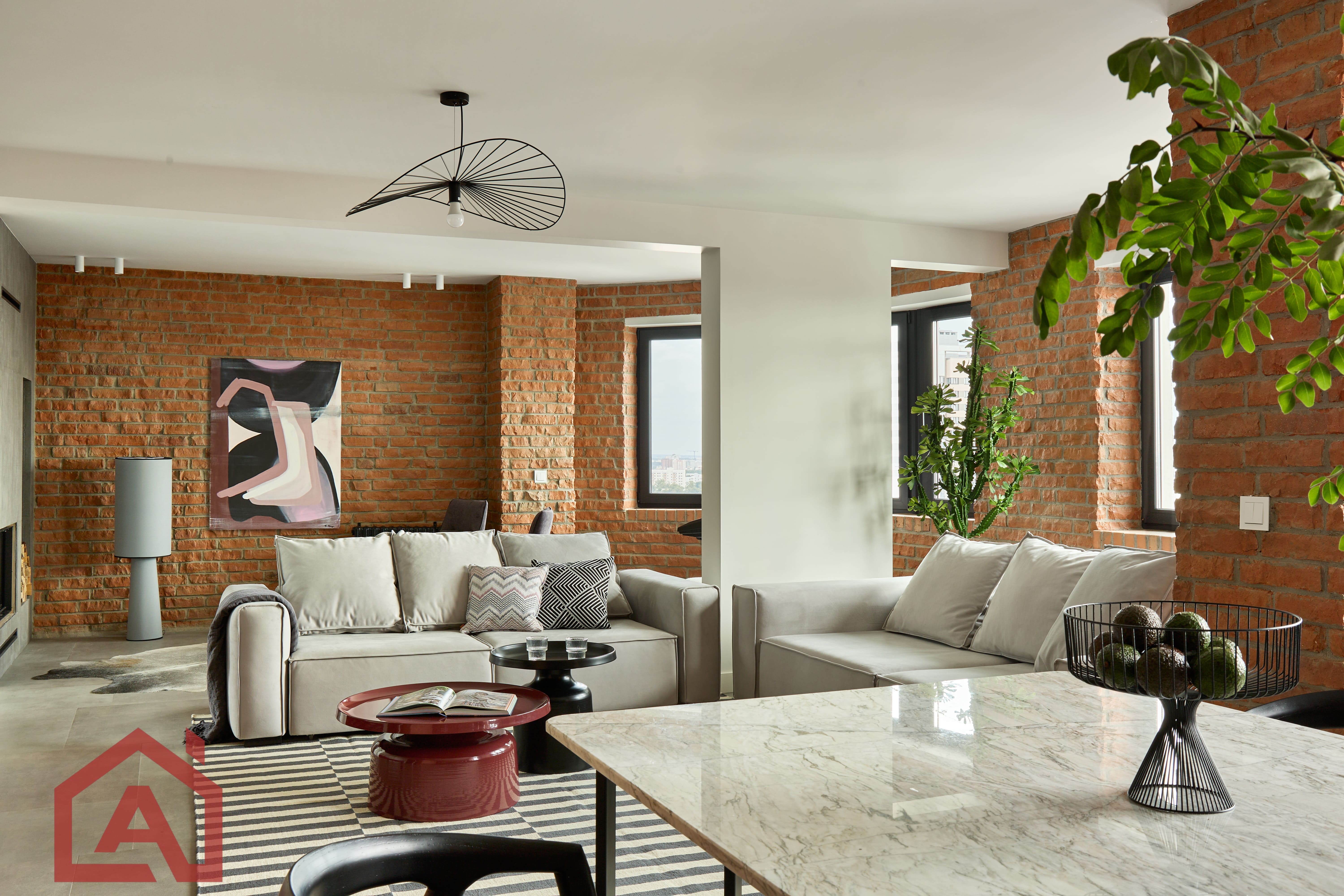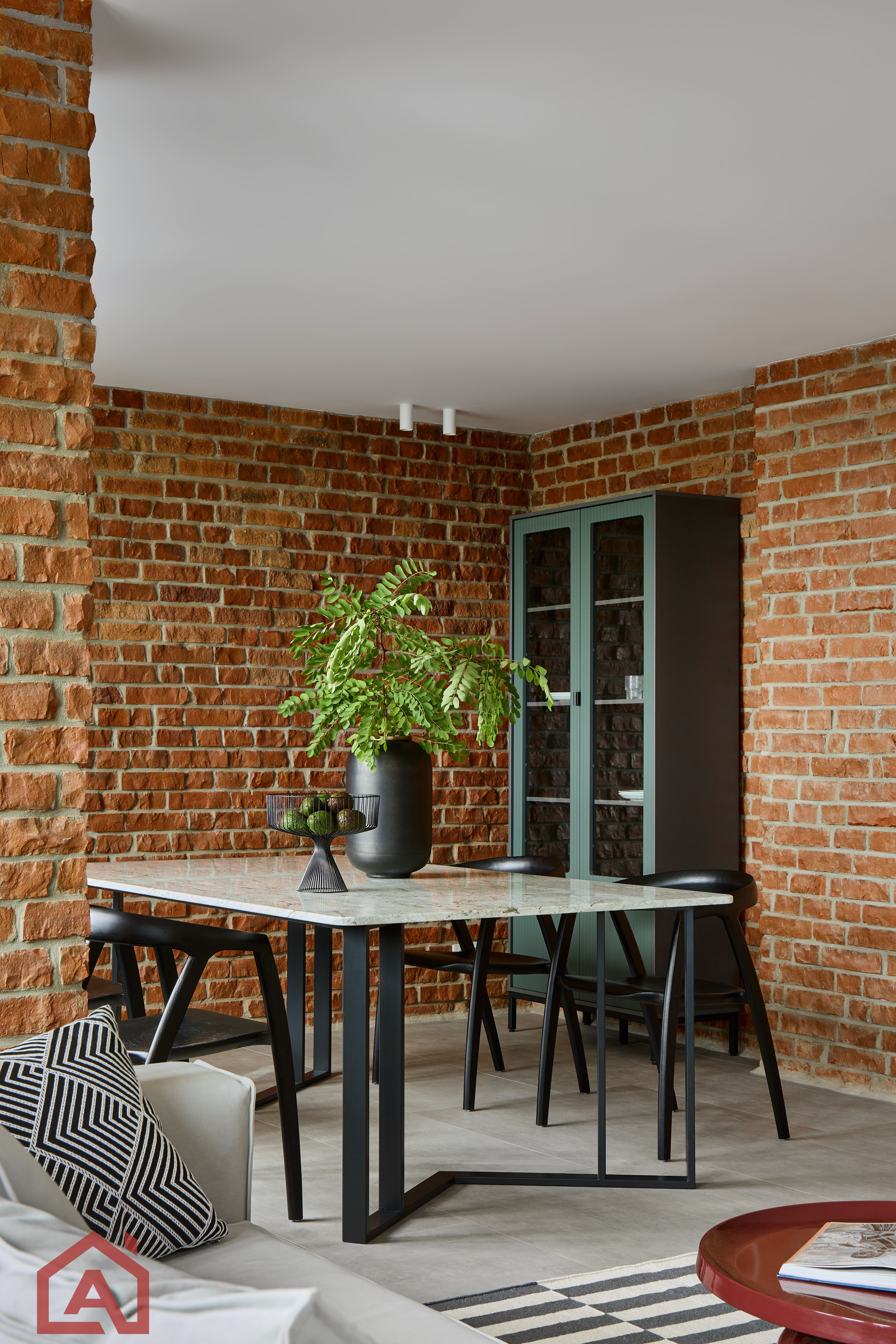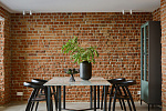 • Второй этаж оформлен в стиле лофт. Стены выложены натуральным красным кирпичом.